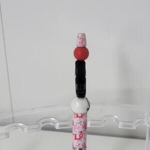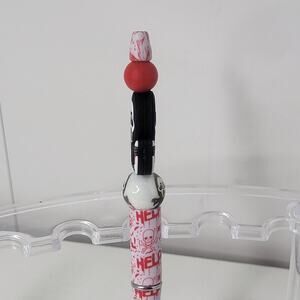This Silicone Horror Focal Beaded Pen features a Ghost Face design from the Scream Bloody theme, making it a unique and eye-catching writing instrument. Handmade in the United States, this ballpoint pen is crafted from black plastic with intricate beadwork detailing the ghostly face. Perfect for collectors or fans of horror-themed memorabilia, this personalized pen is sure to be a conversation starter.