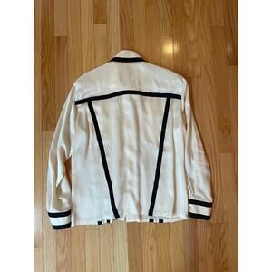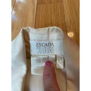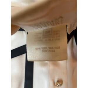 The silk is supple and buttery soft! Escada was really renowned for a well-draped masculine-influenced feminine garment, particularly in the 80s - 90s. This blouse does not disappoint! I see a bit of a militaristic influence with the black trim, but the buttons are luxe and very 80s extravagant! Minor spot noted- may come out with cleaning.