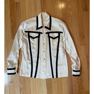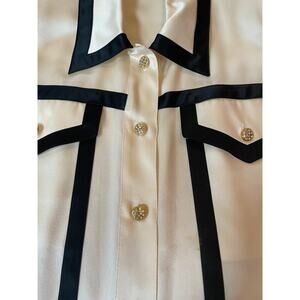 Silk 80s Escada Couture Blouse, Creme w/ Black Trim, Gold w/ Rhinestone Buttons