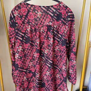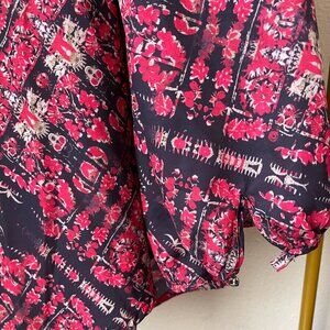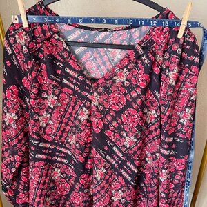 Beautiful silk boho top in vibrant red, black, and gold. Fits like a large. Perfect with jeans or skirts for vacations, brunches, or music festivals. Longer hem in back. Perfect condition.