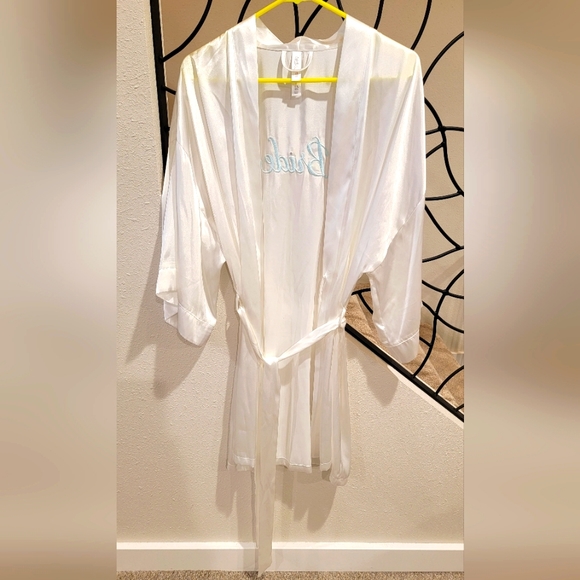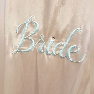 Smooth Silky robe that says "Bride" on the back in beautiful baby blue embroidery. This was a wedding gift but it was too large on me. It's never been worn or washed, no tags though.