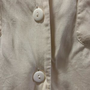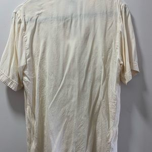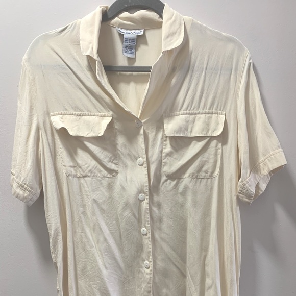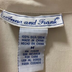 Thrifted women’s silk button top. Super soft. Great for lounging around the house or tucked into a jeans. Color is more off white/yellowish than photos show. Happy to share more pics.