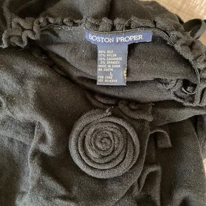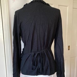 Black ruffled v neck crossover sweater that ties in the back, has a pretty fabric flower at the waist.Long sleeves. Fabric is 69% Silk, 17% Nylon, 12% Cashmere, and 2% Spandex. Minimal use.