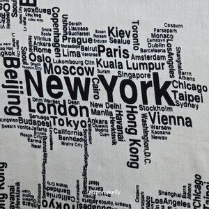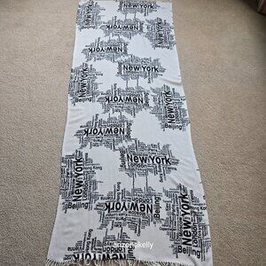 This scarf is in excellent condition and doesn't appear to be used. There's no pilling or wear showing, no pet hair, and no odors. Repeating print of major metropolitan cities around the world.