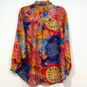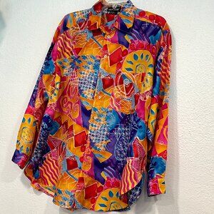 Women's Plus Size 3XL Vintage Silk Club Blouse ~ Bright and Vivid MultiColor Pattern ~ Lightweight 100% Silk ~ Machine Washable ~ Button Front ~ Long Sleeves ~ One Pocket ~ Rounded Hemline ~ NOTE: Size Tag Missing so Please Review Measurements Provided Below for a Proper Fit ~ Excellent Gentle Pre-Owned Condition from a Smoke-Free Home