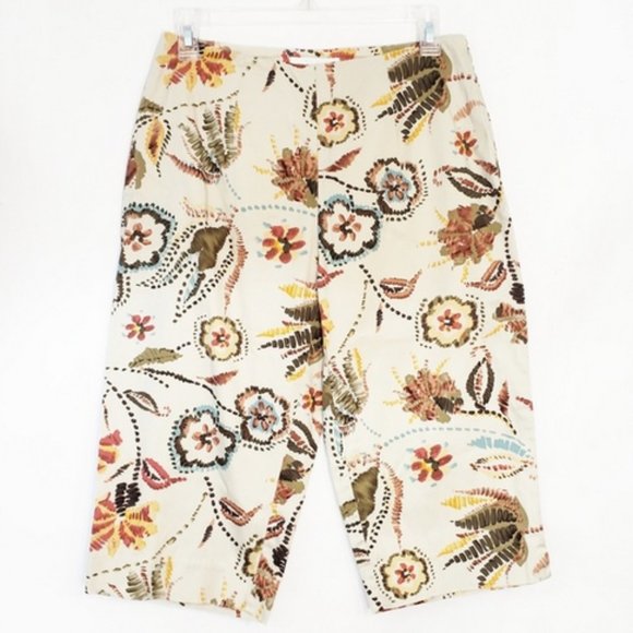 Size 4 Petite. Stretchy Cotton/Spandex mix. Machine Washable. Off White/creme base with eye catching light blues, reds and yellows. Dress up or down!