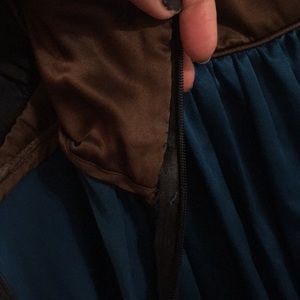 Cynthia Rowley dress, size 04, in deep tri-color silk. Black silk, edged with chocolatey brown at bust. Deep, moody teal sheath. Fabulous tie design on sides. Can be worn for cocktail, or a sassy choice for black tie!