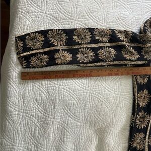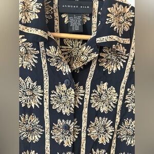 Elegant floral top by August Silk. Features a black background with tan floral design. Button-up style.