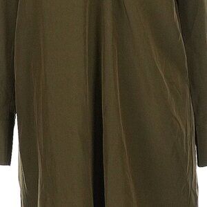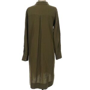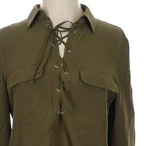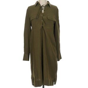 Long sleeves, collared, lace-up, shirtdress, green, classic, midi-calf length, minor fabric imperfections. 55% silk, 45% viscose