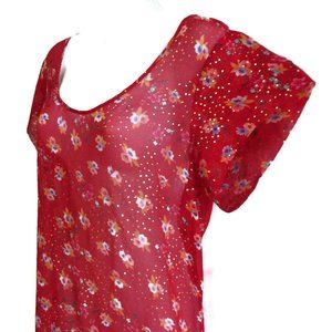 Ella Moss Tunic Dress Shift Sheer Lurex Floral Ruffle Red. Wear Over Your Own Slip or Cami. Gold Metallic Dots. Scoop Neck. Short Sleeve. 100% Silk. Dry Clean. Tagged Size L.