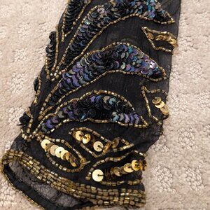 This gorgeous vintage 80s floral beaded sequined 100% silk long sleeved blouse is black with gold and iridescent sequins, intricate beading along the neckline and wrist cuffs. It features a precious scalloped hem, lined with beading, and sheer sleeves. It's in absolutely perfect condition, never been worn, with original tags.