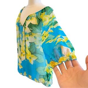 Features an all over Hawaiian floral print on sheer silk fabric, scoop neckline with v cut out and drawstring fastening, long sleeves with elasticated sleeve ends, and a high low hem. 100% silk. Great preowned condition, no flaws.