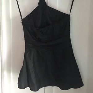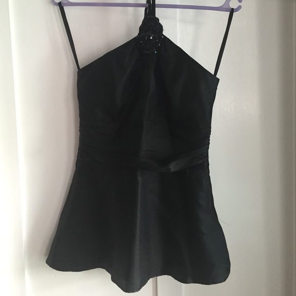 White House Black Market Silk Halter Top. Gathered at the waist with a slight flare and beaded appliqué at the neck. Beautiful top with Jeans or Dress Pants!