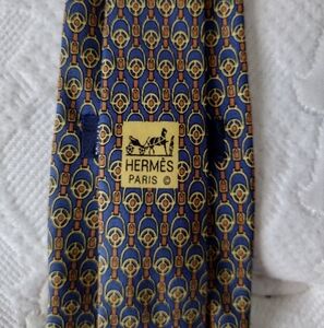 100% silk Hermés tie with yellow and orange pattern on blue.
