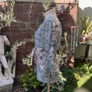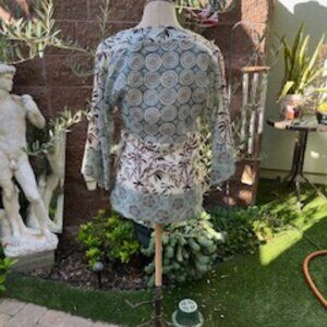 Central Park West brand size small silk kimono, tie front womens top Blue and brown on white background all silk New, never worn.