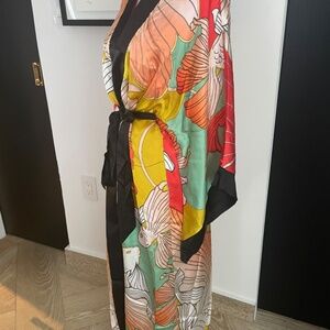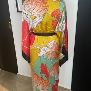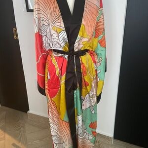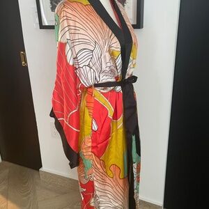 This is an initial print of a brand kimono that didn't quite make it to Bloomingdales as the pattern needed some adjusted. The fit is one size that will accommodate a size small to medium frame.