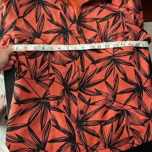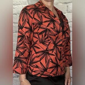 Stylish 100% silk vibrant orange button-up shirt/shacket with black bambooprint. Stunning look! Perfect for work or going out!