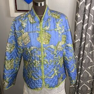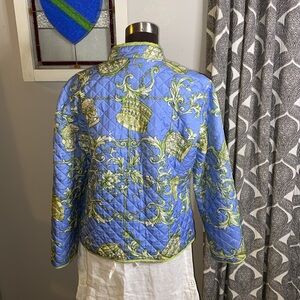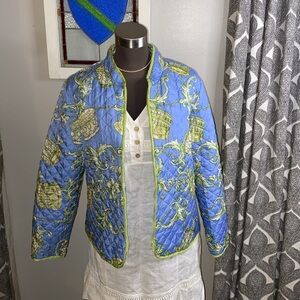 Silk Land 100% silk exterior quilted jacket. Size large. Measures 21” across the chest, 24” long & has 23” long sleeves. In excellent condition- one small spot of loose stitches (see last photo)
