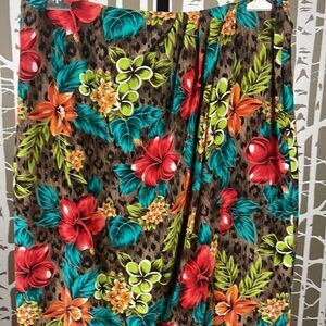 Silk Leopard & Hibiscus Tropical Print Wrap Style Maxi Skirt. This fun and colorful skirt is made of luxurious 100% silk with an allover leopard and tropical floral print in shades of brown, black, turquoise, red, orange, bright green and yellow. Faux wrap style with hidden zip back entry. Unlined and feels so soft against the skin. This is a timeless beauty that will always look fresh - wear it with a simple tank top and sandals and you will instantly look put together! Gently worn with no flaws to note. I am 5'3" and this is a maxi length skirt on me but might fit like a midi length if you are taller so please see pics for measurements.