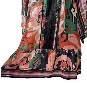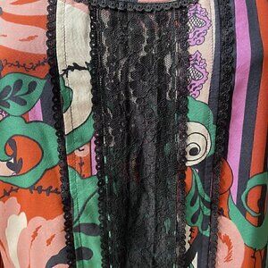 Beautiful all silk Urban Outfitters Odille, floral multicolor mod style tunic with delicate gorgeous black lace trim. Has a Johnny Was look. Shoulder puff 3/4 sleeve with pleated elastic cinched cuffs. Ruffle tier bottom. Sheer but not see through. Lightweight.