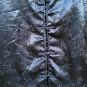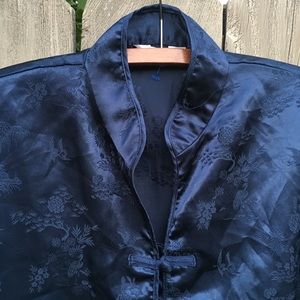 Silk Oriental Style Top. Mint Condition. It's rather hard to capture its true color and pattern in photo, but it's a royal blue with bonsai, flower, and swan print. 🎎 fits like a M/L. 🌸