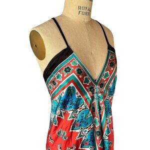 super cute and soft silk dress! great for summer ! doesn’t say size but most likely around a size 2-4