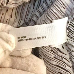 Favorite features: The button at neck & wrists are fabric covered. The mini ruffle fabric design is unique. Lightweight. Breezy. Can wear untucked. Travels well, doesn't wrinkle in suitcase.