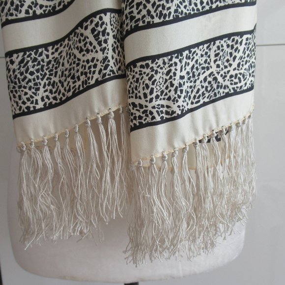 Silk Rectangular Abstract Scarf Shawl Wrap White and Black with fringe 10" x 51"