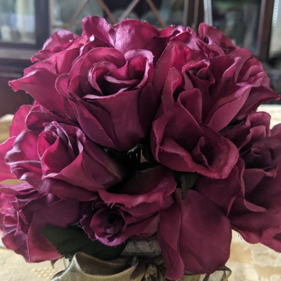 Just a hint of beauty to add to any bookcase table decoration or end table. You will love the elegance and sophistication of simplicity! Silk red roses arranged in a marble-like base with gold lame ribbon!