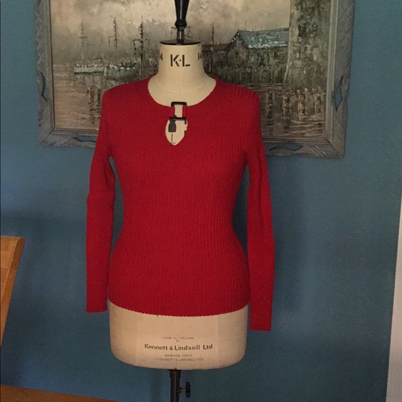 Lightweight gorgeous red with keyhole front. Tortoise shell accent piece. Wears beautifully. Mannequin is 12/14 size. So has stretch. 24” length, sleeves are26”. Wash delicate lay flat to dry.