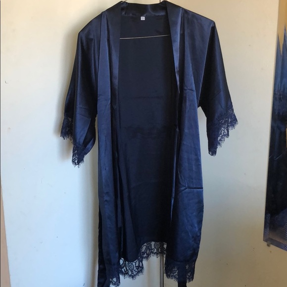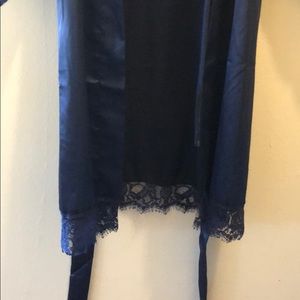 Dark navy silk robe with lace lined sleeves and bottom. Has belt to tie.