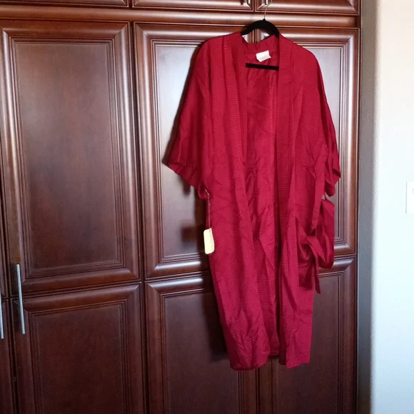 Red custom made robe of silk elegance. Size small. One pocket. Never worn.