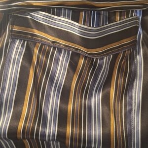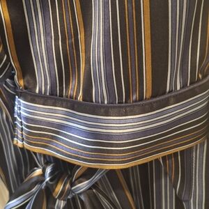 Stylish long sleeve blouse with vertical stripes. Features a mix of black, white, and gold colors.