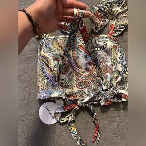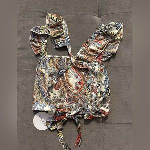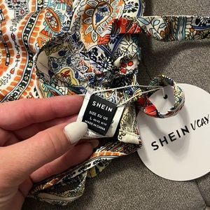 SHEIN size L but fits like a M. Really cute silk Mike fabric that has a cross back that ties at the bottom. This is a crop top length.
