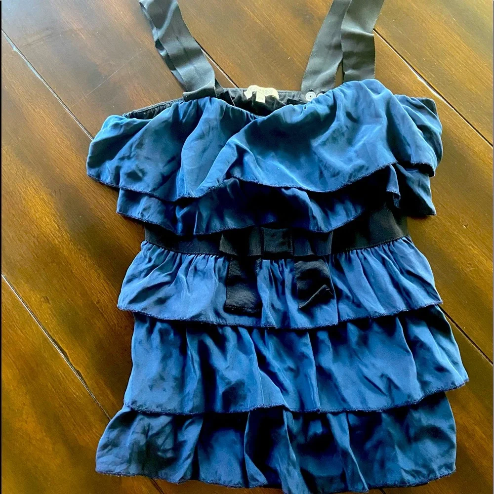 This whimsical silk, ruffled tank is just fun with the little bow in front. Stretch back secures the fit, and button straps can be unbuttoned for a strapless look
