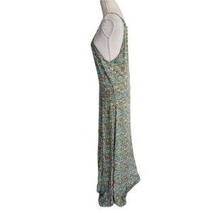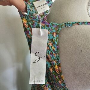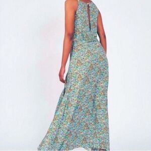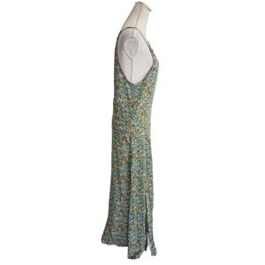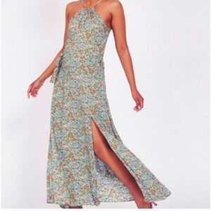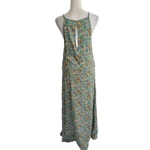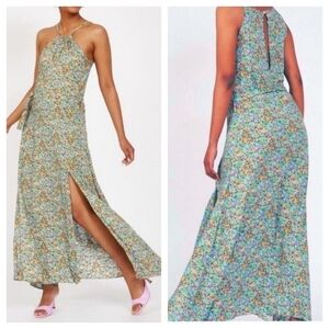 Silk & Salt floral maxi dress with front leg slits, adjustable straps, and belt loops.