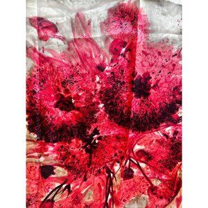 This silk scarf showcases a vivid abstract floral design in red and green tones. The elegant rolled hem enhances its sophisticated finish.