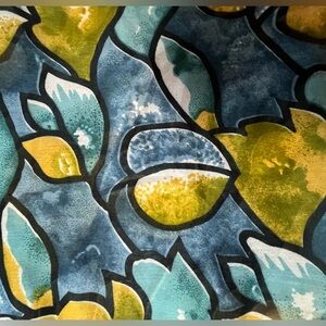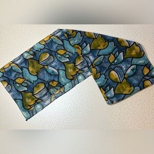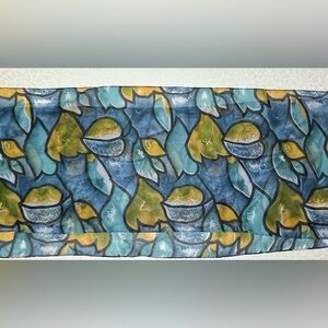 Ladies vibrant abstract print silk scarf. Soft. Rolled edges. 2- small holes in the scarf, see pictures. Fair used condition.