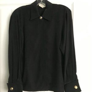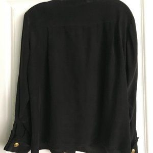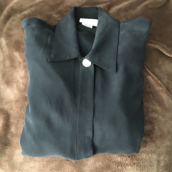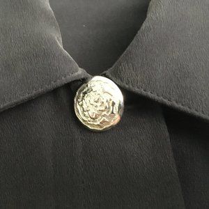 Hidden buttons down front of blouse with 1 button on top which is a silver tone.