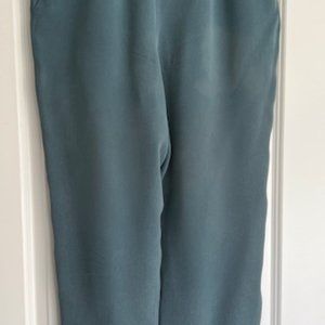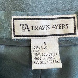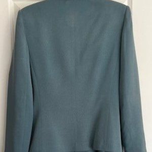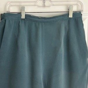 Teal, brushed silk suit. Pants have side zip and pockets. Generously sized from the '90's. Fully lined. Offers welcome. Photos won't display in full size. Excellent condition. Jacket bust is 19" across; jacket waist is 18" across. (Jacket looks great over a black dress). Pants waist is 15" across.