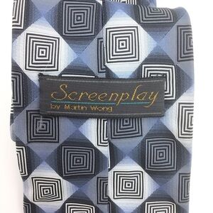 100% silk tie by Martin Wong. It is blue and grey and measures 60 inches in total length. Good condition.