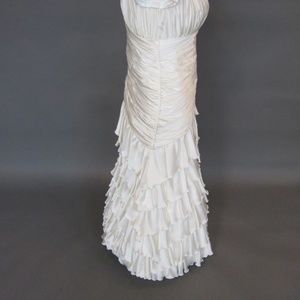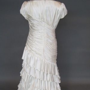 100% Real Silk Charmeuse asymmetrical skirt with gathered tiers. Gathered bodice with ruching detail. Lined. Invisible zipper.