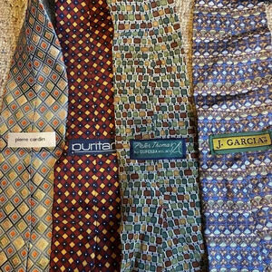 Enhance your wardrobe with this 4-piece lot of silk ties from top brands like Pierre Cardin, Puritan, Petter Thomas, and J Garcia. Made from premium silk material, these ties are the perfect addition to any men's clothing collection.