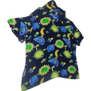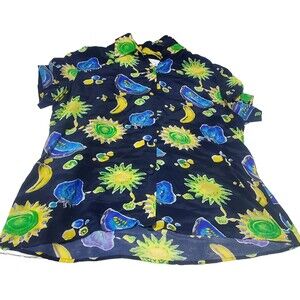 Vibrant navy silk short sleeve button shirt in womens Large featuring an allover tropical print for an effortless resort vibe and breezy, luxe drape. Classic collar, button front, and lightweight pure silk make it perfect for vacations, beach dinners, and warm-weather city looks styled with denim, linen shorts, or a slip skirt. K Arnold brand noted; condition and exact measurements should be confirmed from photos, with natural silk sheen and fluid movement ideal for soft girl and coastal-inspired aesthetics.
