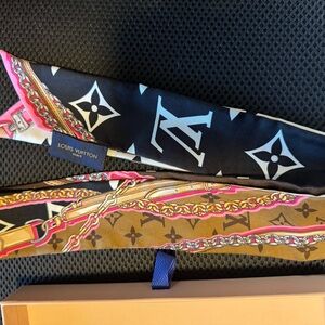 Chic Louis Vuitton scarf featuring classic monogram. Black base with pink and cream accents. Perfect for adding elegance. This is an authentic LOUIS VUITTON Silk Ultimate Monogram BB Bandeau in Black. This very chic 100% silk scarf features motifs such as keys, locks, and bags with a Louis Vuitton monogram motif background. Length: 46 in