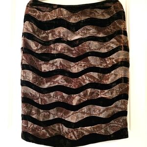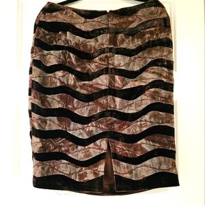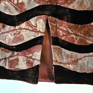 Below the Knee, Beautifully Designed Layers of Chocolate Brown Velvet Material with Delicate Tafetta Skirt. This Lined Piece is Timeless and Perfect for Cooler Weather with Boots and a Sweater or Blazer. 69% Viscosse/16% Polyamide/15% Silk. Back Slit and Zipper with Clasp.