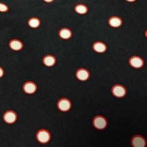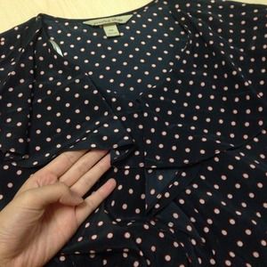 Dotted Navy Dress with dots surrounded in a red circle. Has front ruffle to add an accent but not too dramatic. Also has pockets and an elastic waist band to accentuate the waist. 100% Silk
