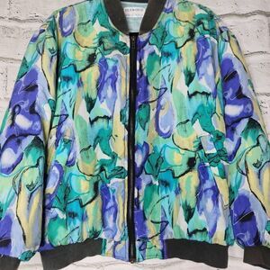 Silk World Abstract Graphic Pattern Ribbed Trim Bomber Jacket Blue Green Large