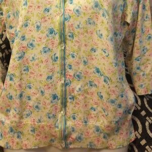 Silk blend floral sweater with glass accent buttons and ribbon t…