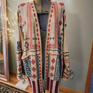 Beautiful navy and white bell sleeve silk blouse with elegant silk lace detail trim. Peplum waist gives the blouse a more fitted look.